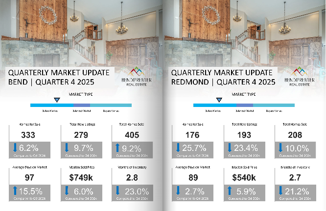Click Here to see the Q4 Market Trends for Bend Real Estate and Redmond Real Estate, as well as the Q4 real estate trends in Sunriver, La Pine, Sisters, Prineville, Madras, Powell Butte, and Black Butte Ranch. In Q4 2025, the Bend Oregon Real Estate market and surrounding communities experienced what happens typically the end of the year with sellers taking their properties off the market for the holidays. With less inventory for competition, those homes still available often had more looks and in some markets, more homes sold in Q4 2025 than did in 2024. Days on market varied per area as did increases or decreases in home sale prices. All areas experienced seller's markets with the exceptions of La Pine, Madras, and Powell Butte which were buyer's markets and Prineville which was balanced. Madras, Sisters and Sunriver did not follow normal market trends for 4th quarter and experienced an increase in new listings during this time rather than a decrease.