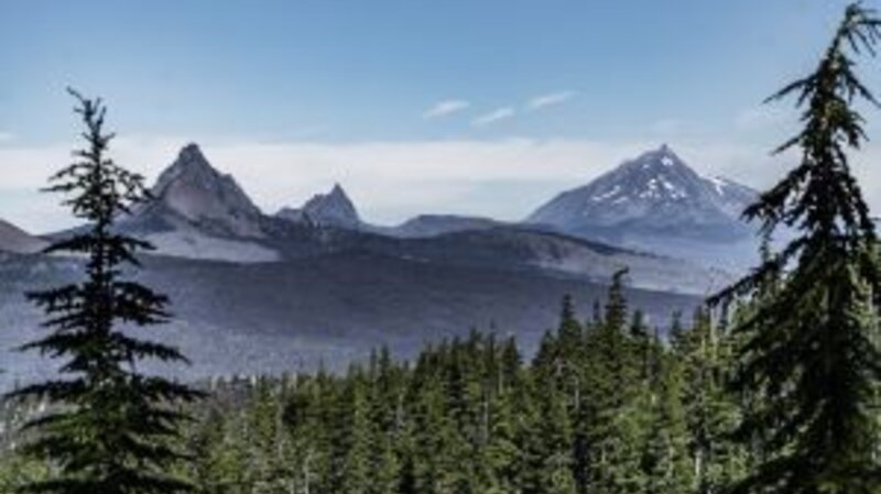 The Obsidian Trail is named for the obsidian stones and pebbles which are very evident in certain areas of the hike - and which will glitter beautifully when the sun hits them. The hike gains 2139 feet in elevation and provides for stunning views of North and Middle Sister, including vistas of Collier Glacier. Obsidian Falls and wonderful lodgepole and hemlock forests are also treats to see along the way. Lava fields, mountain meadows, small alpine lakes and, when the loop is followed, views of Mt. Washington, Three Fingered Jack and Mt. Jefferson are also visible. We also saw the smoke from the Green Ridge Fire, but it did not impact our enjoyment of the area during the day. The full loop was just under 12 miles, but we did take a side trip up the flank of Middle Sister, hoping to find the trail which we have heard exists to the summit, but failed to locate it.