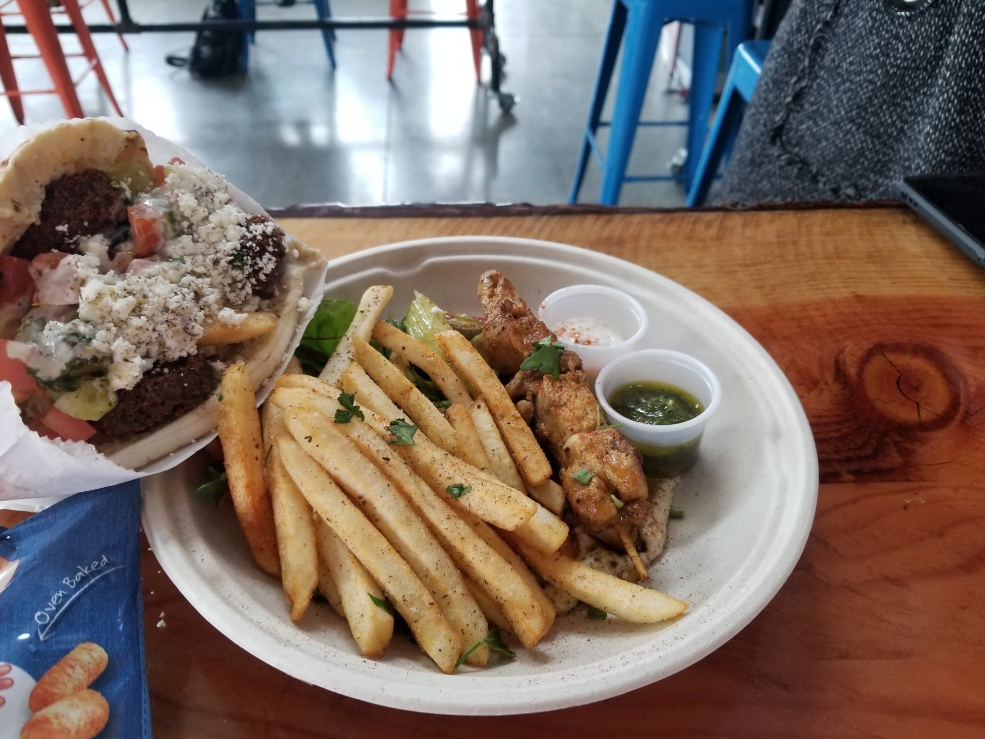 When we arrived at the Yacht Club, we instantly spotted where we were to have lunch. The truck was so wonderfully decorated with brightly colored pomegranates and a fun two tone paint job. We appreciated the simple menu and explanations of what the sauces were on the menu board. Needless to say, we wanted to try a few different items and each was excellent.