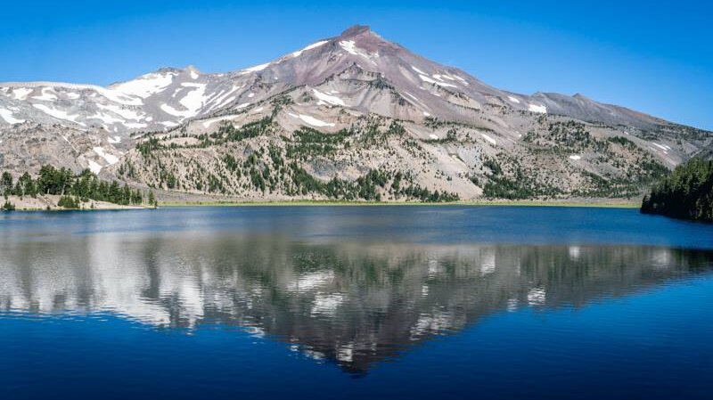 To reach Camp Lake, part of the Chambers Lakes in the Three Sisters Wilderness, hikers starting at the Pole Creek Trailhead have to trek trough 4 miles of dead trees, the result of 2012's Pole Creek Fire. We did this hike July 24, 2021 and it was a warm day. Despite the heat and the dry conditions, we saw some interesting things along the way, among them what we believe was a young Red Tailed Hawk sitting in one of the burned trees as it scouted the area for rodents. We also had fun crossing the North Fork of Whychus Creek as it flows out of Diller Glacier on Middle Sister.