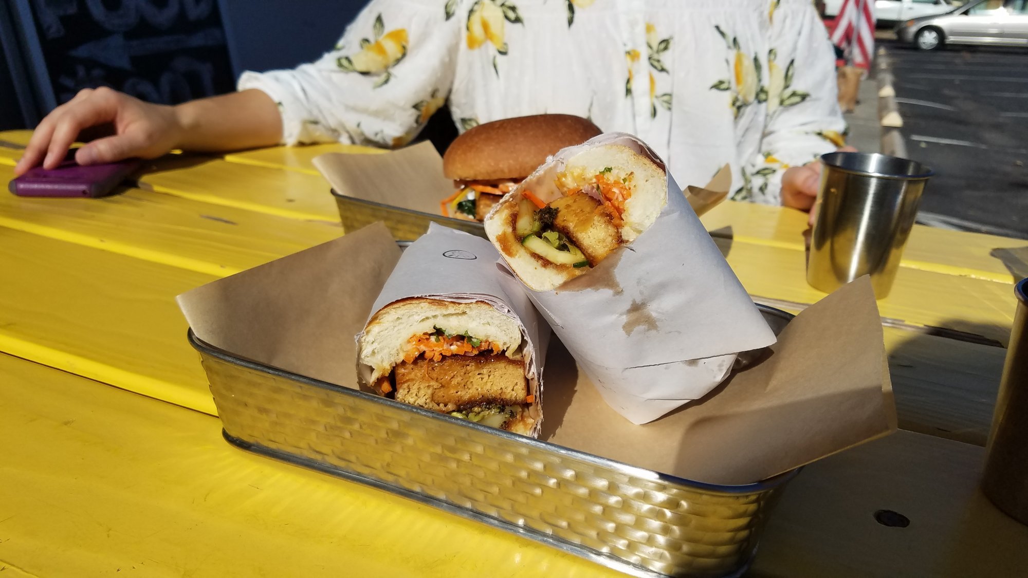 After leaving no trace behind of the fritters, we started in on our mouth watering sandwiches. Our two selections for today were the Bulgogi Tofu Sandwich and the Sesame Dijon Tempeh Sandwich. Each had unique flavors and we were equally impressed with both. The Bulgogi Tofu Sandwich offered a wonderfully flavored piece of tofu, miso roasted broccoli, pickled onions, pickled cucumbers, cilantro and a spicy siracha mayo. We absolutely could not get enough!