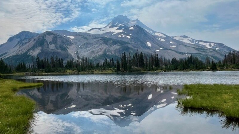 For Central Oregon hikers looking for something different that does not require a paid permit, the climbers' trail on Middle Sister is well worth it. Most hikers would start in the burned forest at the Pole Creek Trailhead located off forest service road 15 outside of Sisters (the parking at the trailhead requires $5 payment or a forest pass). After hiking the trail to the junction with Green Lakes Trail 17, trekkers continue on Trail 17 toward Park Meadow. Shortly after crossing Soap Creek is the junction with Camp Lake which hikers should take to reach the unmarked junction with the Climbers' Trail. If hikers miss this trail, it loops with another section of the Camp Lake trail near one of the branches of Wychus Creek which hikers to Camp Lake have to cross. Climbers don't cross the creek, but instead hike upstream toward Middle Sister.