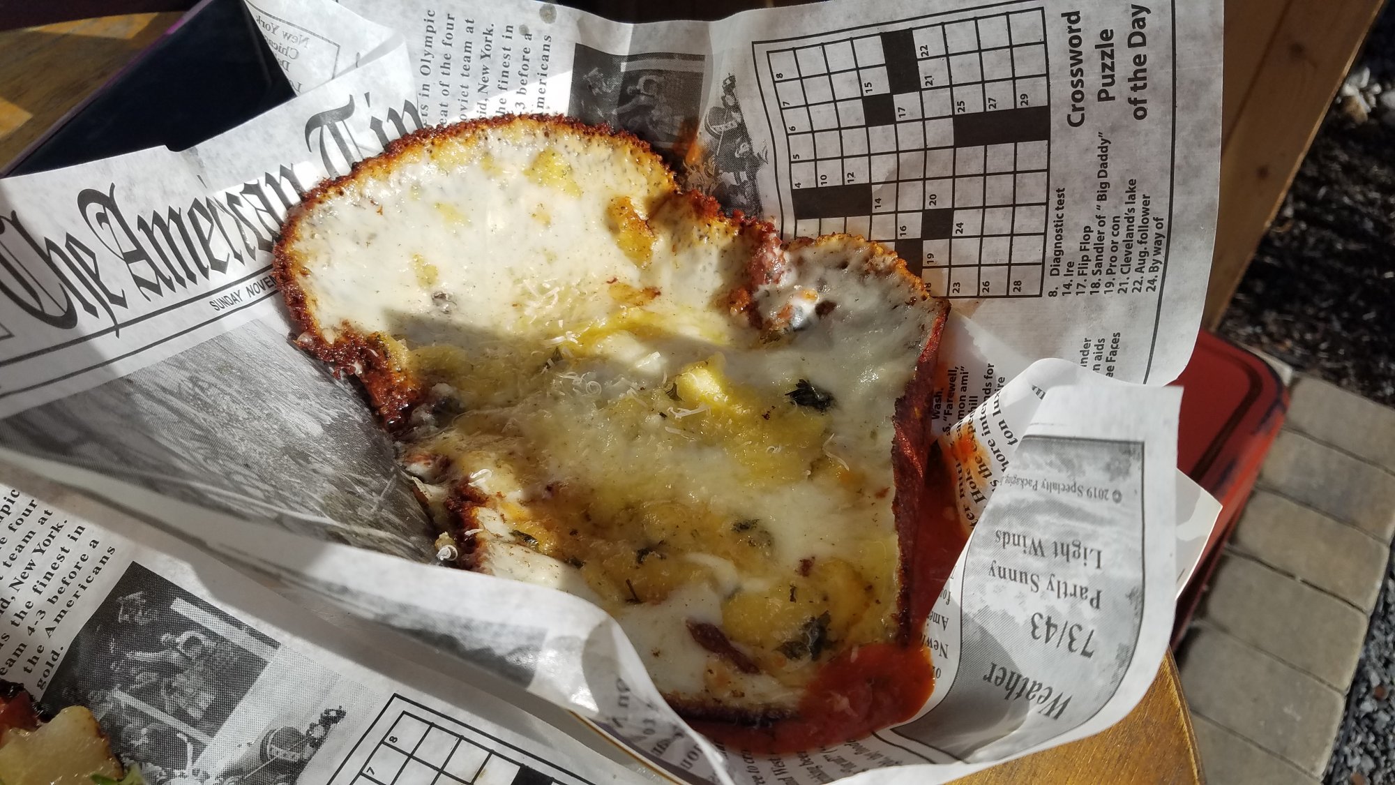 This charming location is modeled after the warming huts in the Deschutes National Forest that many locals and tourists alike snow shoe, ski, snow mobile, and maybe even dog sled to during the winter months. We felt the atmosphere was warm and inviting and we cannot wait to sit inside by the large fireplace when COVID allows again. However, despite not being able to use the indoor space, they had many tables set up outside with appropriate distancing, various warming options, and three food trucks. On this food adventure, we tried Abe Capanna's Detroit Pan Pizza + Italian and they did not disappoint us.